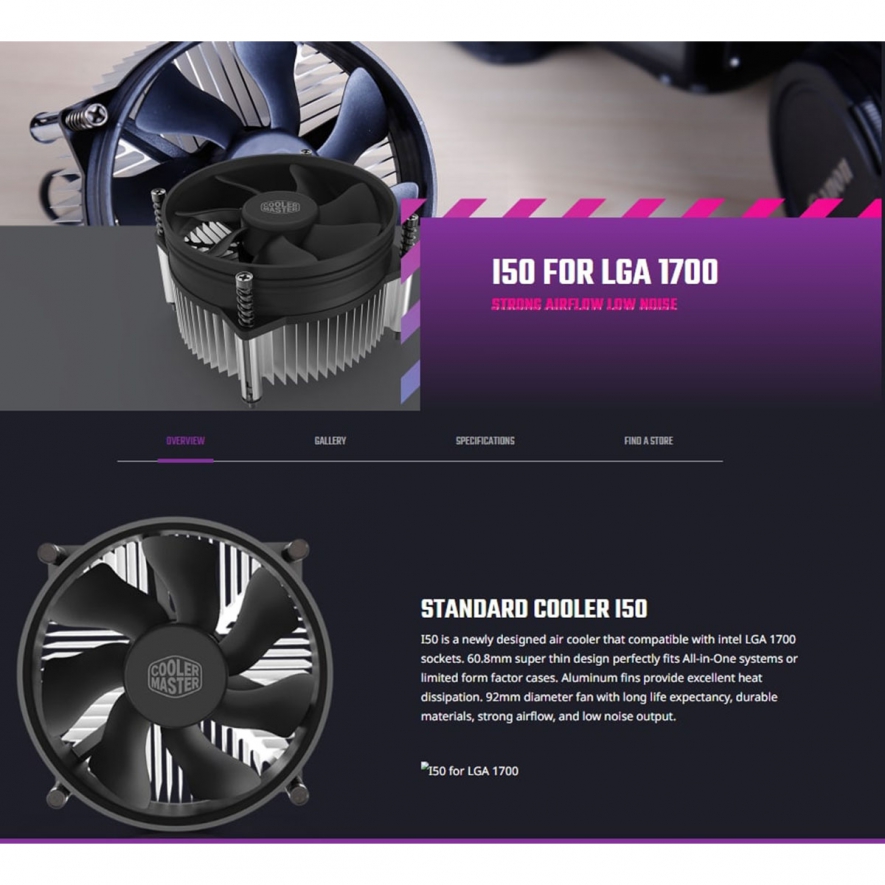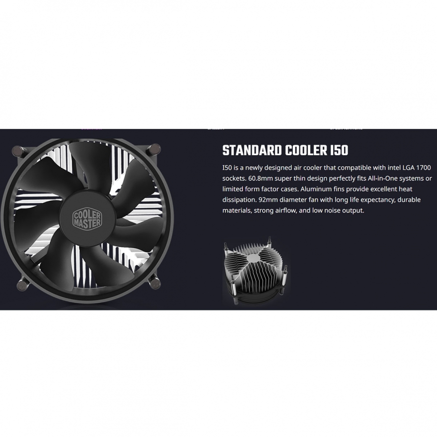 - Cooler Master I50 Is A Compact And Efficient CPU Cooler Designed For Intel Sockets.Featuring A Low Profile Design With An Aluminum Heat Sink And A 92mm Fan,It Delivers Reliable Cooling Performance While Maintaining Quiet Operation.Ideal For Small Form Factor Builds And Everyday Computing Needs.