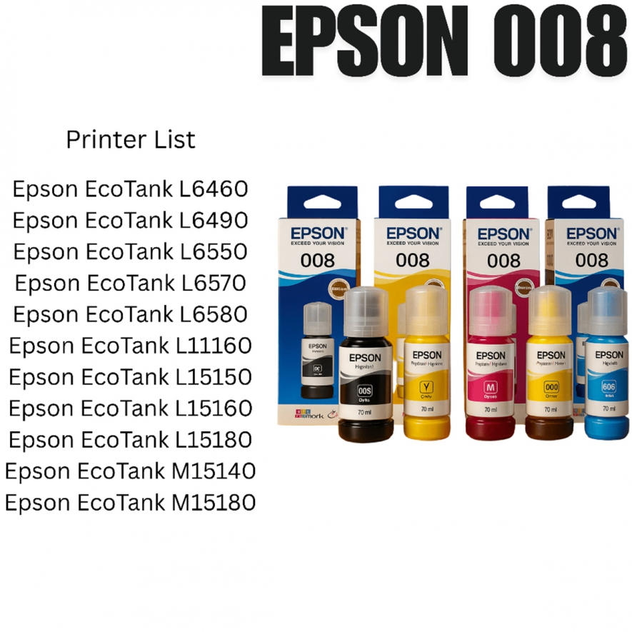 - Epson 008 Cyan Ink Bottle Delivers Vibrant,High Quality Blue Tones With Sharp,Consistent Results. Designed For Epson Eco Tank Printers, It Provides Smooth Ink Flow,Excellent Page Yield And Reliable Performance For Everyday Printing Needs. Ideal For Both Home And Office Use.