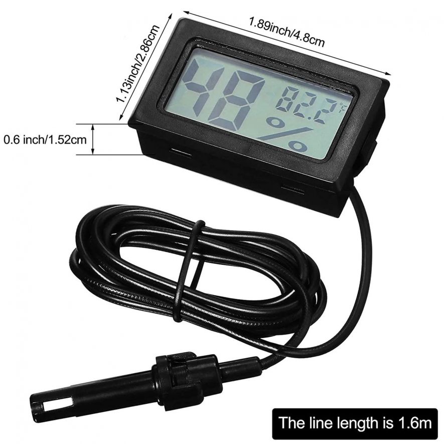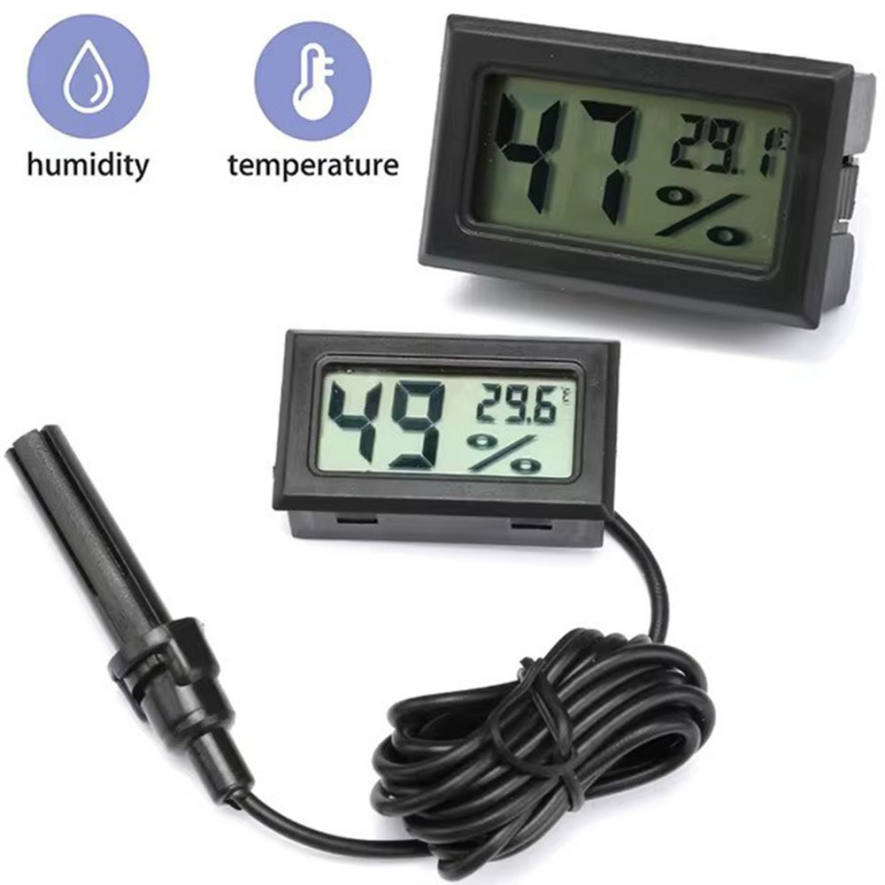 - A Compact Digital Hygrometer Thermometer Designed For Accurate Environmental Monitoring. This Device Simultaneously Measures Ambient Temperature And Relative Humidity Via An External Probe,Displaying Real Time Readings On A Clear LCD Screen. The Unit Supports Both °C And °F Temperature Units,Fast Response Sensing And A Wide Measurement Range,Making It Ideal For Homes,Greenhouses,Incubators, Server Rooms,Warehouses And Other Controlled Environments. Typical Features Include Humidity Range Up To 99% RH,Temperature Range From Approximately –50 °C To +70 °C, 5 – 10 Second Response Time, Strong Probe Sensitivity,Compact Lightweight Design And Battery Powered Portability.